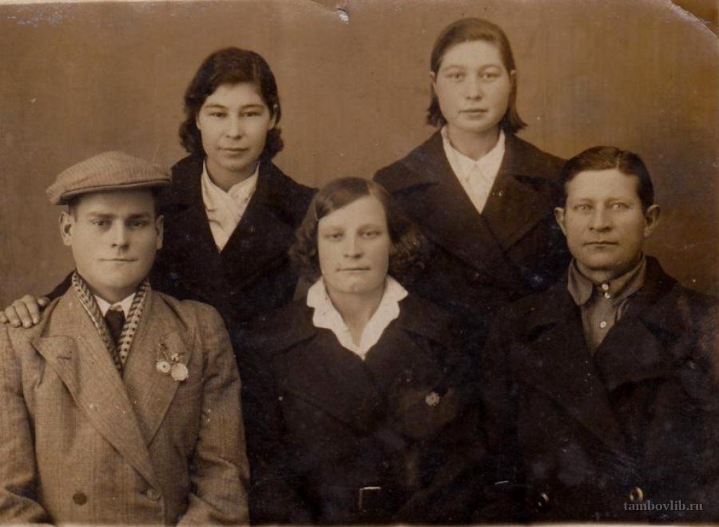 На снимке сидят - Любин Никифор Иванович, Любина Евдокия Ивановна, Жмырев Михаил Семенович, стоят - Жмырева Мария Андреевна, Жмырева Марфа Андреевна. Фотография предоставлена библиотекарем филиала Коноплянский Поверновой Мариной Валерьевной.1940 Межпоселенческая центральная библиотека Инжавинского района Портрет