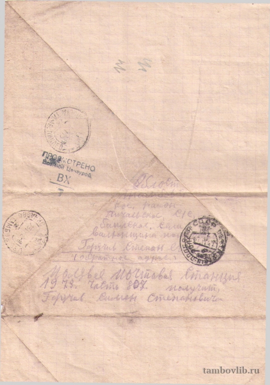 Письмо с фронта Горячева Степана Егоровича домой. 1942 г.1942, ноябрь Межпоселенческая центральная библиотека Пичаевского района Письмо