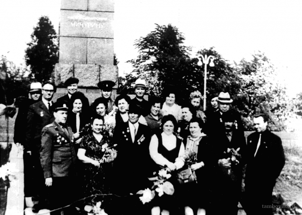 Группа ветеранов Краснознаменной, ордена Богдана Хмельницкого Станиславской 161-й стрелковой дивизии, сформированной в г. Мичуринске, у памятника И.В. Мичурину. Май, 1973 год. Дивизия прошла с боями более 7 тыс. километров, от Воронежа до Берлина, освободив от фашистов свыше 700 населенных пунктов. Среди них из Мичуринска: первый ряд 2-я слева АФАНАСЬЕВА Р.М., второй ряд 4-я справа ЗАБЕЛИНА В.А., третий ряд 1-я справа ДРОКИНА Р.В., 2-я справа ЧЕЛИДЗЕ Т.А.