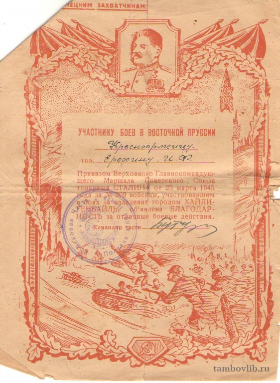 Участнику боев в Восточной Пруссии красноармейцу Ерохину Ивану Федоровичу