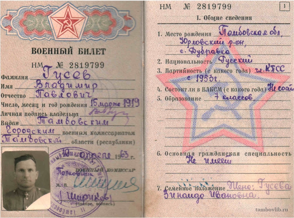 Военный билет Гусева Владимира Павловича