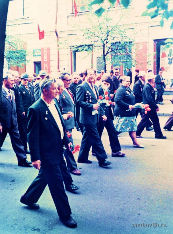 Шествие ветеранов на воинское кладбище. Мичуринск, 9 мая 1985 г. В первом ряду 2 слева КОНОВАЛОВ Василий Никитич.