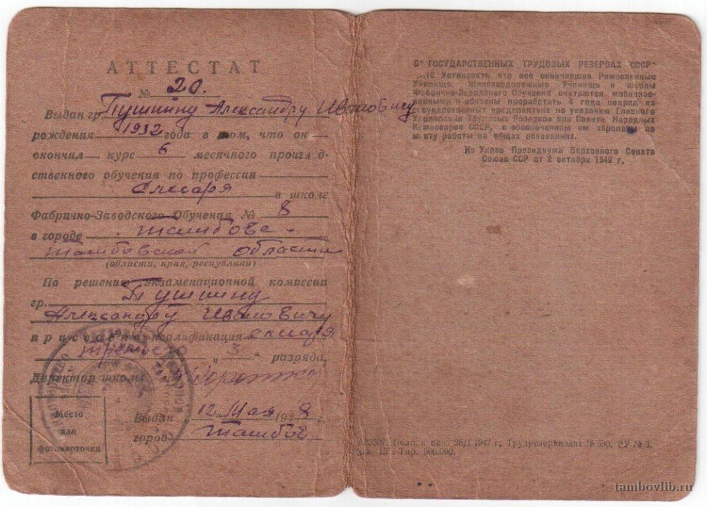 Выдан Пушнину Александру Ивановичу.12 мая 1948 Межпоселенческая центральная библиотека Пичаевского района Документ