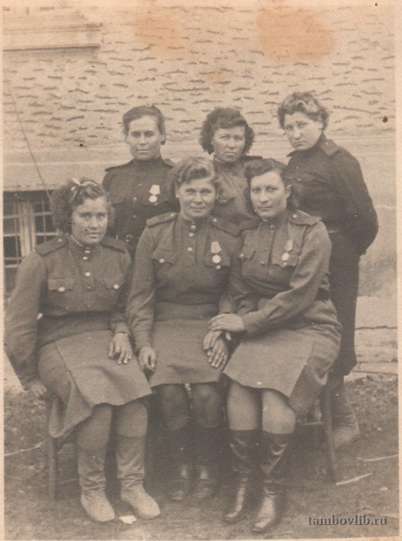 Сержант Леденёва (Харина) Анна Ивановна (1919-1995) сидит крайняя справа. Уроженка с.Ржакса была призвана в армию в 1943 году. Воевала на 3-м Украинском фронте в отдельном батальоне связи. Была телеграфисткой-морзисткой. Награждена медалью "За боевые заслуги". После войны вернулась на родину и всю жизнь работала телеграфисткой. Фотография храниться у её дочери Юрьевой Галины Егоровны.Добавлена 5 Февраля 2015