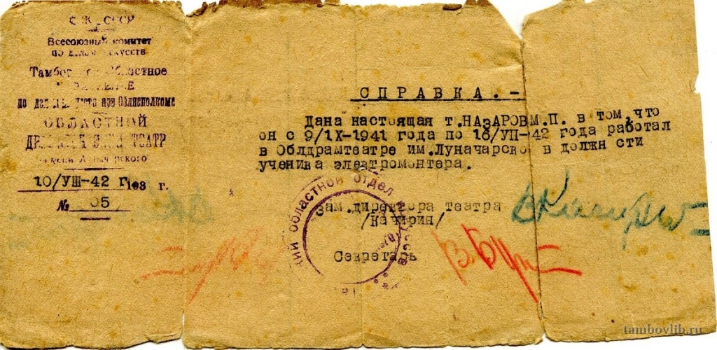 Справка Назарову Михаилу Петровичу из Тамбовского Областного драматического театра