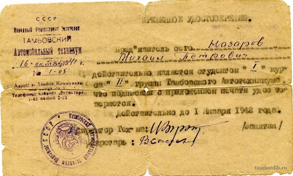 Временное удостоверение Назарова Михаила Петровича о поступлении в Тамбовский Автомобильный техникум