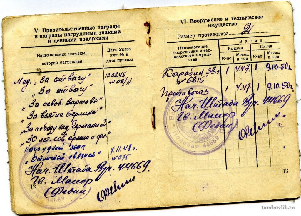 Назаров Михаил Петрович родился 13 ноября 1926 г. в с.Иноземная Духовка Тамбовского района. С 9 сентября 1941 г. начал работать сначала учеником, а затем электромонтером в Тамбовском Областном драматическом театре им. Луначарского. В ноябре 1943 г. был призван в армию рядовым. Участвовал в боевых действиях в составе 1-ого Белорусского фронта 1342 сп. в/ч 44669, обеспечивал связь между подразделениями. Имеет боевые награды и грамоты: «За Отвагу», «За Отвагу», «За освобождение Варшавы», «За взятие Берлина».25 сентября 1949 ТОУНБ Документ