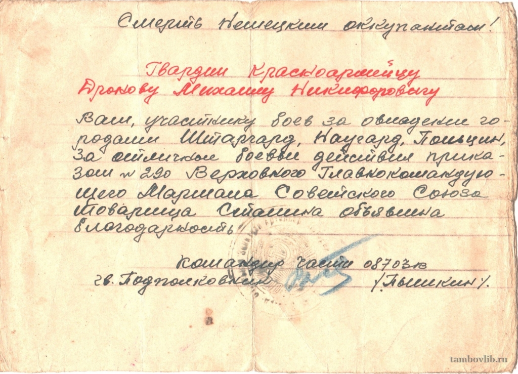 Благодарность,за освобождение городов ЕвропыМежпоселенческая центральная библиотека Сосновского района Документ