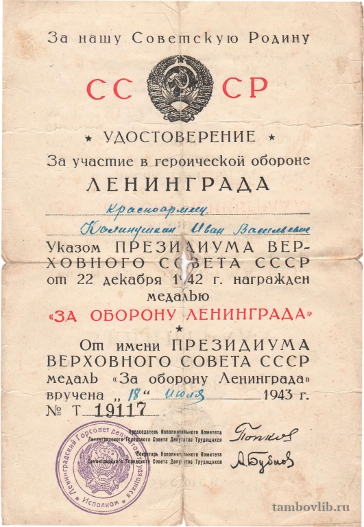 Удостоверение к медали "За оборону Ленинграда"