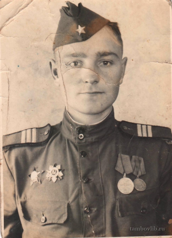 Родился 16 мая 1923 года в с. Туголуково Жердевского района Тамбовской области. Призван а армию в октябре 1941 года. Воевал на Калининградском фронте в должности радиста. Был ранен. После лечения направлен на Сталинградский фронт. Воевал под Курском и Орлом, на 2-м Белорусском фронте. Дошел до Берлина. Награжден многими боевыми орденами и медалями. В 1952 году, вместе с присвоением звания младшего лейтенанта, был призван в кадры Вооруженных Сил и направлен в Бакинский военный округ ПВО на границу с Ираном. В 1956 году вернулся на родину и работал на партийно-хозяйственной работе. Скончался 15 ноября 2003 года. Фото из семейного архива дочери - Ширяевой Раисы Николаевны.13 октября 1945 Знаменская ЦБС Портрет
