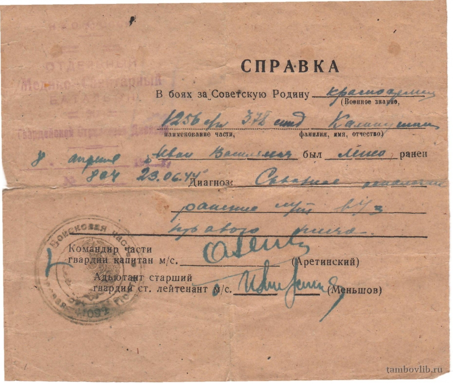 Справка о ранении выдана Калинушкину Ивану Васильевичу. Из личного архива его внучки Крыковой Людмилы Ивановны.