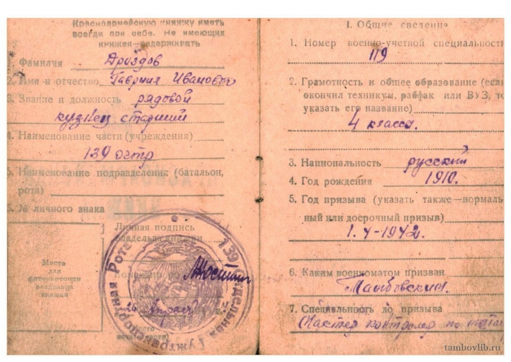 Красноармейская книжка Дроздова Гавриила Ивановича