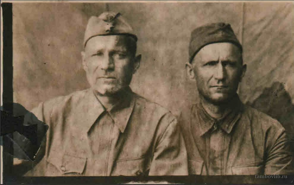 Родился в 1895 г. в д. Гвоздевка Инжавинского района Тамбовской области, крестьянин. Призван в ряды Красной Армии в 1941 г. Служил в г. Кушке в тыловых войсках, обслуживающих фронт. Вернулся домой 29 мая 1945 г. Имеет медаль «За Победу над Германией в ВОВ 1941-1945 гг.». Умер в 1974 г. На фото слева.Добавлена 13 Марта 2015