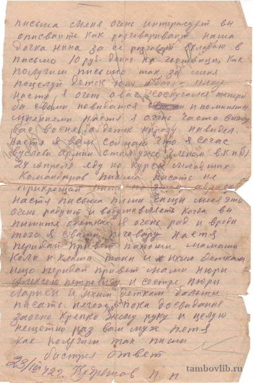 Уроженец Сампурского района Кудряшов Петр Петрович пропал без вести в 1942 году. Из семейного архива дочери - Гордеевой Нины Петровны.23 апреля 1942 Знаменская ЦБС Письмо