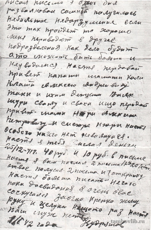 Уроженец Сампурского района Кудряшов Петр Петрович пропал без вести в 1942 году. Из семейного архива дочери - Гордеевой Нины Петровны.01 января 1942 Знаменская ЦБС Письмо
