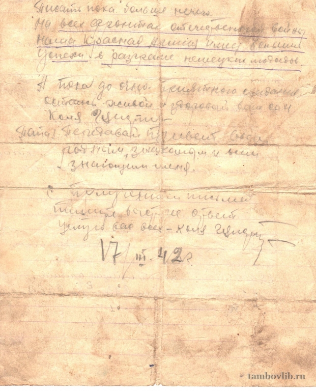 последнее письмо Глистина И. И. пропавшего без вести в марте 194217 марта 1942 Гавриловская районная библиотека Письмо