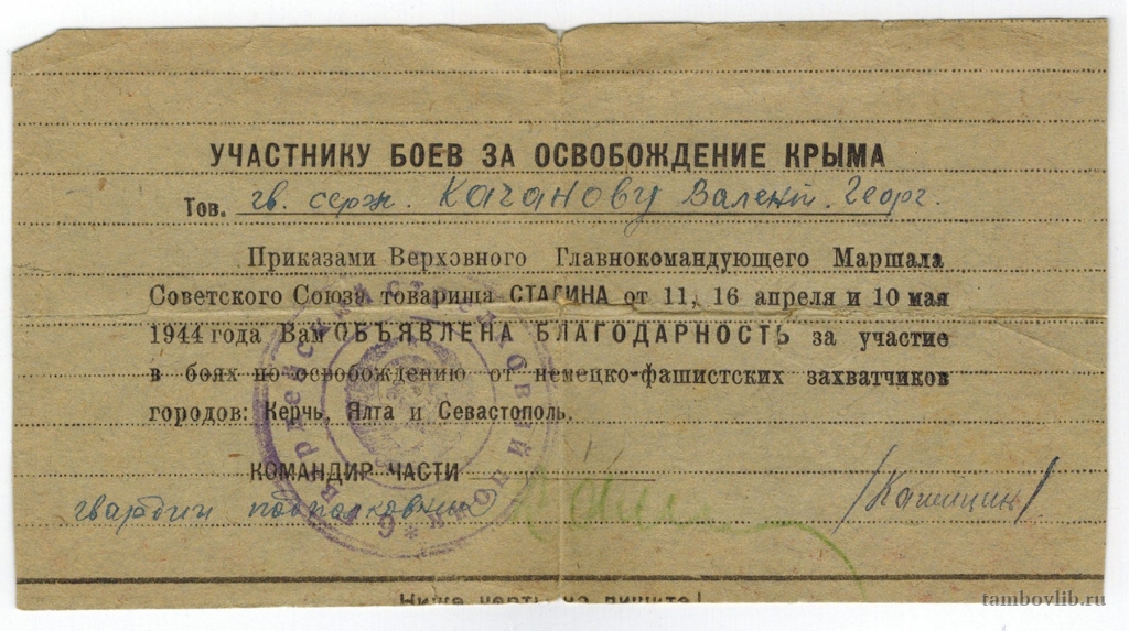 Уроженец Тамбова, вернулся сержантом, участвовал в освобождении Крыма. Жив (90 лет).