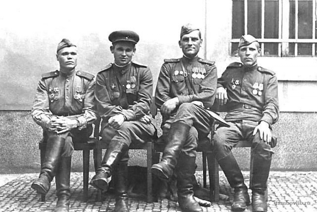 Родился 20 апреля 1915 г. в с. Сухотинка Знаменского района Тамбовской области. Служил сапером, занимался подготовкой собак для подрыва танков. Ушел рядовым, вернулся с войны старшим лейтенантом. На фото второй слева.1945 ТОУНБ Портрет Прага, Чехия