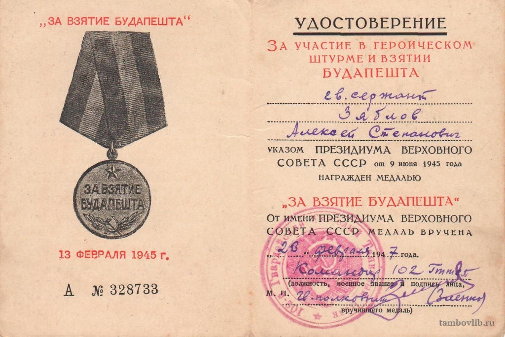 Удостоверение к медали "За взятие Будапешта" выдано гвардии сержанту Зяблову Алексею Степановичу.