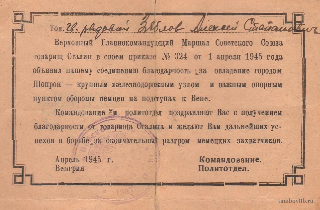 Благодарность от тов. Сталина. Объявлена Зяблову Алексею Степановичу.