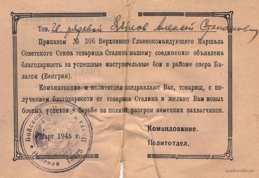 Благодарность Зяблову Алексею Степановичу.