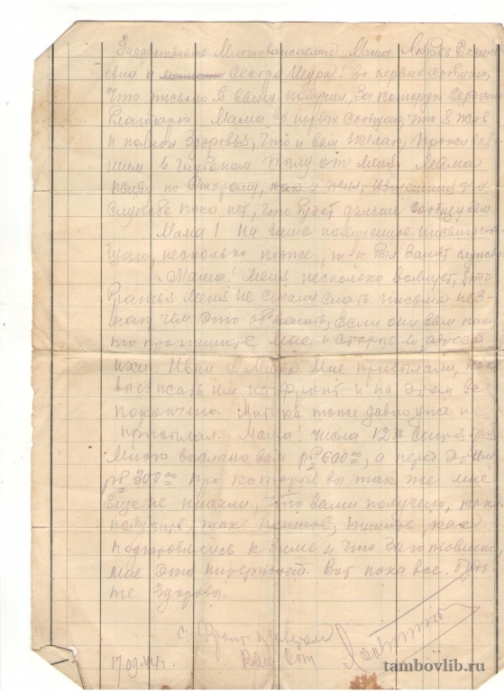17 сентября 1944 Межпоселенческая центральная библиотека Жердевского района Письмо
