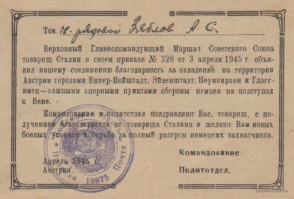 Благодарность от тов. Сталина объявлена Зяблову Алексею Степановичу.