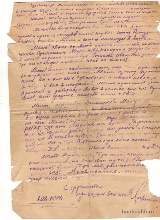 01 августа 1944 Межпоселенческая центральная библиотека Жердевского района Письмо