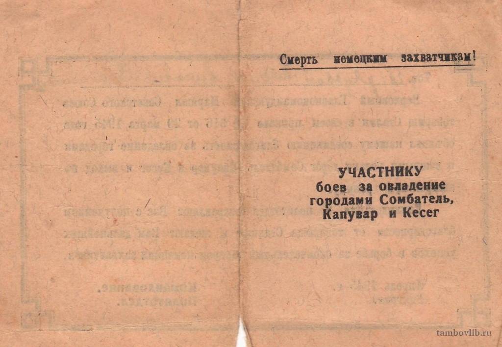 Благодарность от тов. Сталина Зяблову Алексею Степановичу.