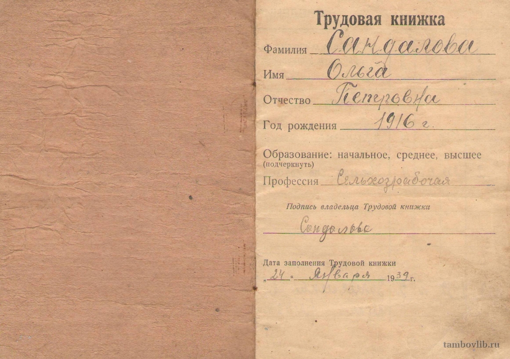 Во время войны находилась в блокадном Ленинграде.1939 Межпоселенческая центральная библиотека Пичаевского района Документ Рудовка, Тамбовская область, Россия, 393985