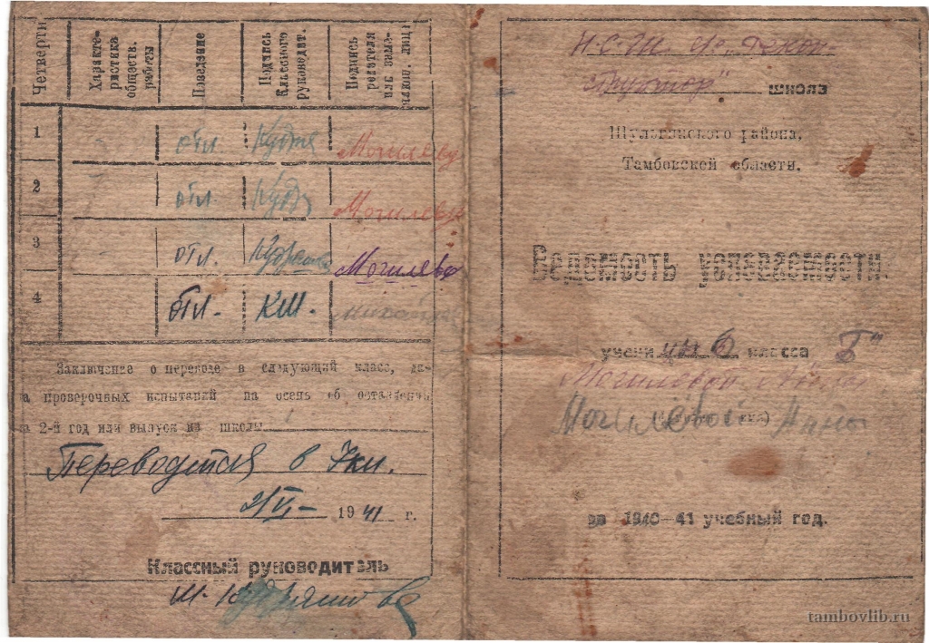 Ведомость успеваемости ученицы 6 "б" класса Могилевой Анны за 1940-1941 учебный год
