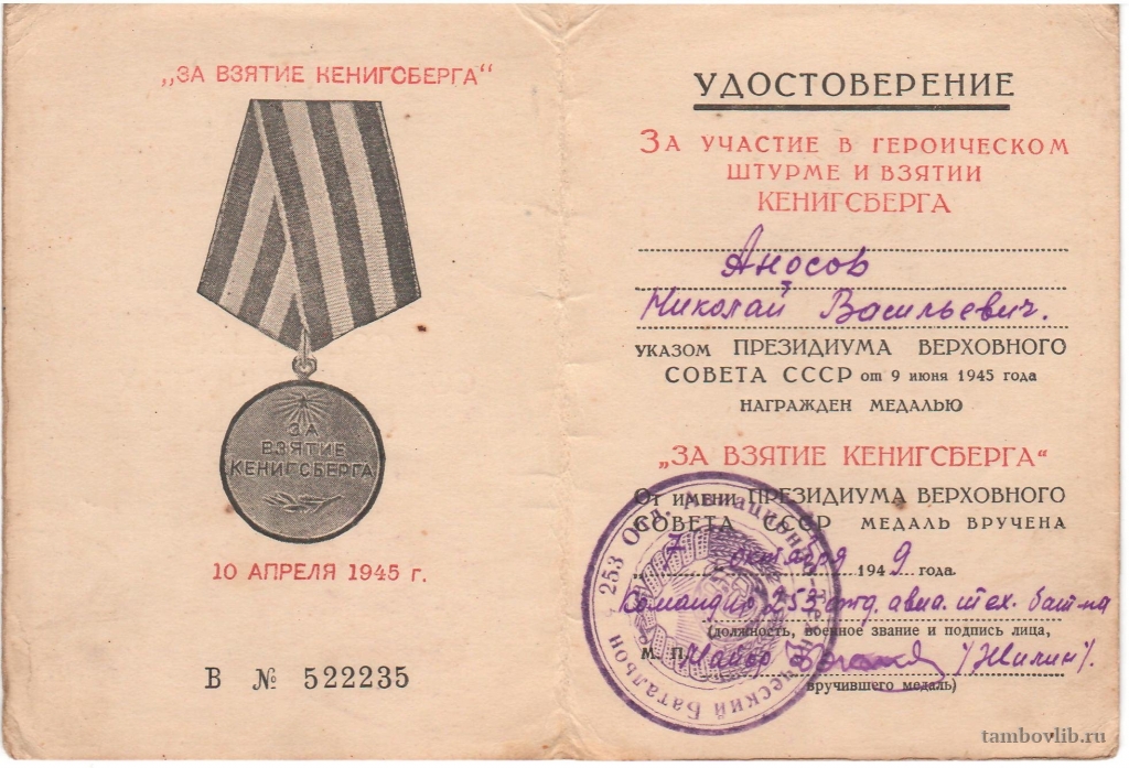 Удостоверение к медали "За взятие Кенигсберга" выдано Аносову Николаю Васильевичу
