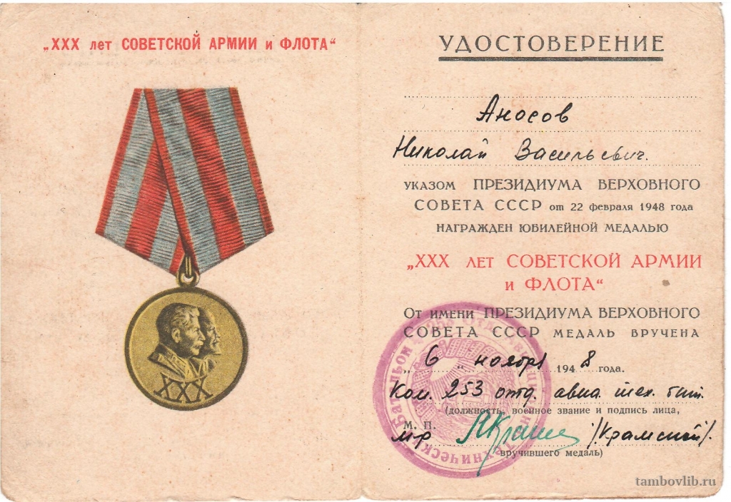 Удостоверение к медали "ХХХ лет Советской армии и флота" выдано Аносову Николаю Васильевичу