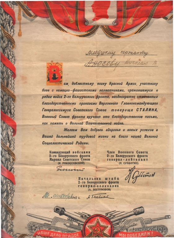 Благодарственное письмо младшему сержанту Аносову Николаю Васильевичу
