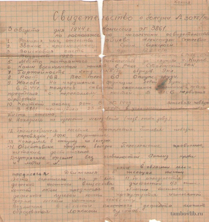 Свидетельство о болезни выдано Зайцевой (Пичугиной) Александре Сергеевне. Из личного архива Филиной Зои Владимировны03 августа 1944 Межпоселенческая централизованная библиотека Петровского района Документ