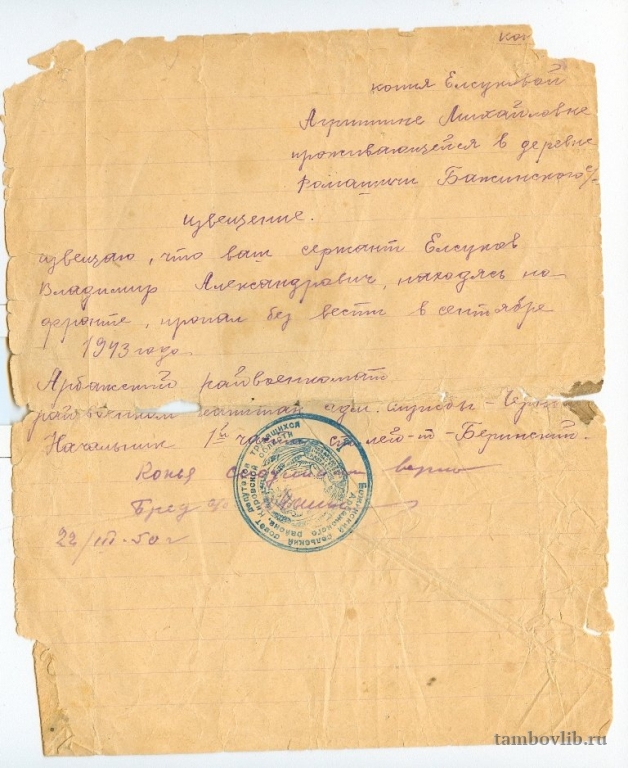 Извещение о том, что Елсуков В.А. пропал без вести
