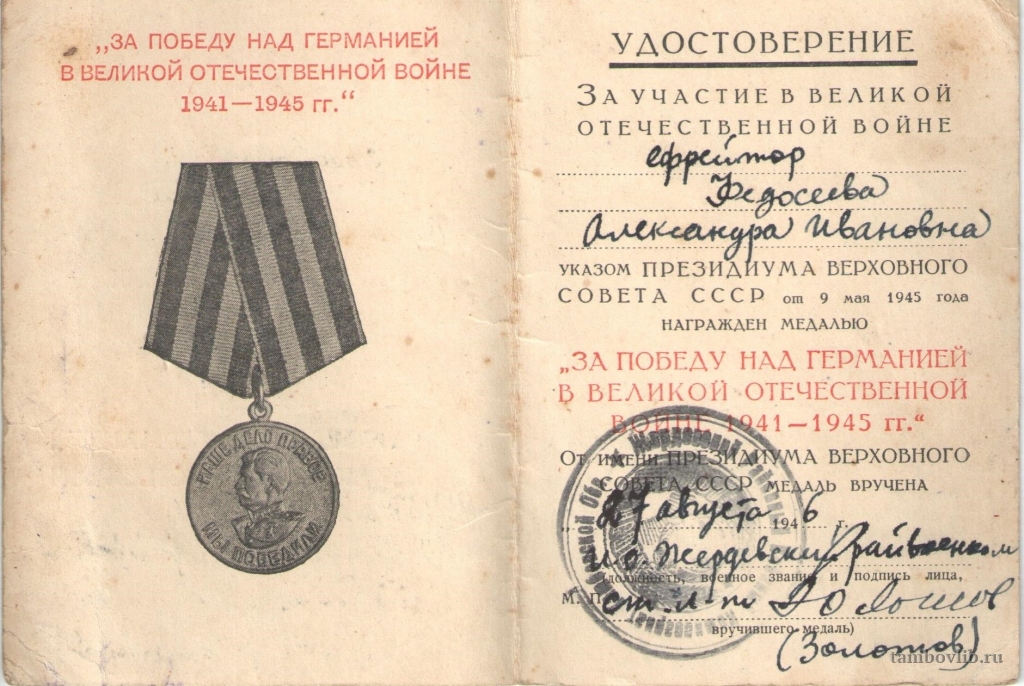 К медали "За победу над Германией в Великой Отечественной войне 1941-1945 гг."27 августа 1946 Межпоселенческая центральная библиотека Жердевского района Документ