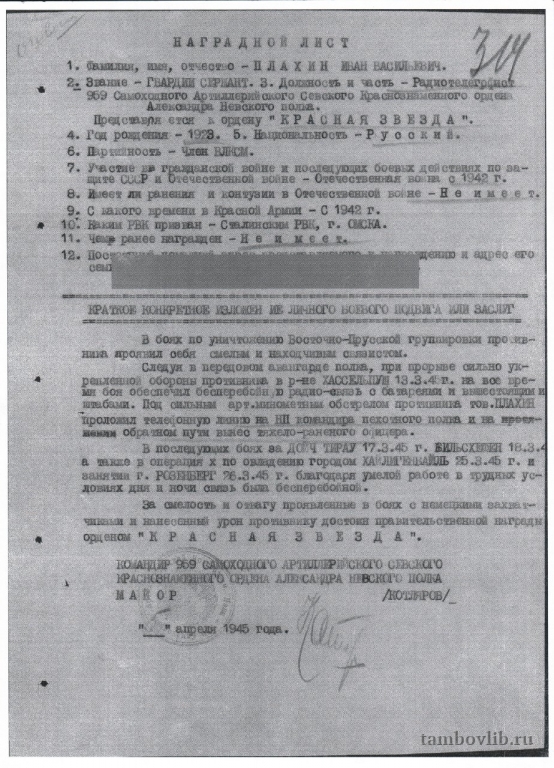 Плахин Иван Васильевич родился 24 августа 1923 года в Омской области в деревне Плахино. С 1942 года призван на фронт. Был три раза ранен под Сталинградом и на границе с Чехословакией, два раза контужен. Награжден орденом Отечественной войны I степени, орденом Красной звезды, орденом Красного знамени, медалями за освобождение Сталинграда, Ленинграда, Кёнигсберга, «За взятие Берлина».Добавлена 18 Марта 2015
