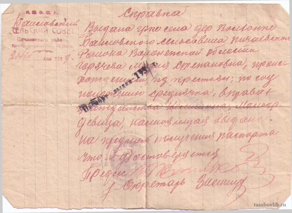 20 декабря 1939 Межпоселенческая центральная библиотека Пичаевского района Документ
