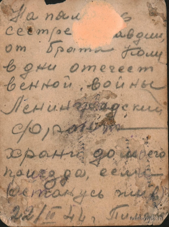Родился 28 апреля 1915 г. в с. Титовка Дехтянского района Тамбовской области. Окончил 8 классов средней школы. 15 декабря 1941 г. был призван на военную службу. Служил радиотелеграфистом ракетных войск и артиллерии. Награжден медалями «За боевые заслуги», «За оборону Ленинграда», «За взятие Дрездена», «За взятие Берлина», «За победу над Германией в ВОВ 1941-1945 гг.», «За доблестный труд в ВОВ 1941-1945 гг.» и юбилейными медалями. Умер 9 марта 1985 г.22 февраля 1944 ТОУНБ Открытка