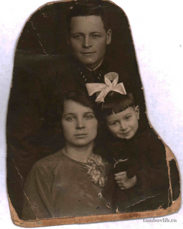 Родился 30 марта 1913 г. в г. Тамбове. Погиб 29 мая 1944 г., освобождая г. Жмеринка, Украина. На фото в центре со своими родственниками.