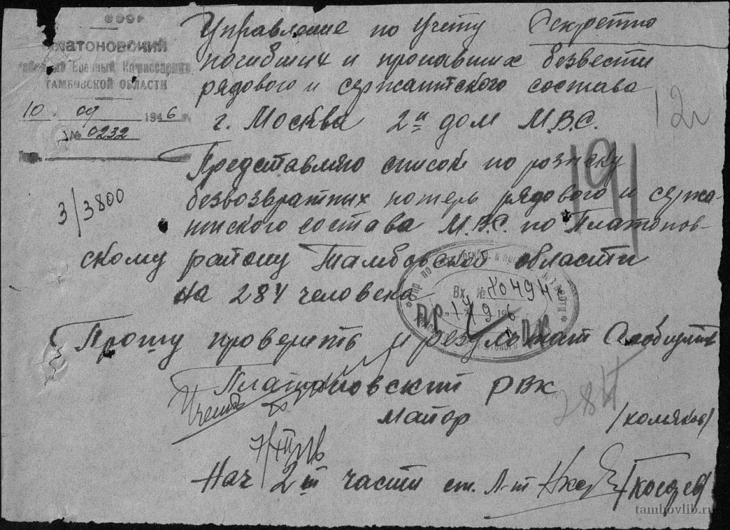 Список по розыску безвозвратных потерь рядового и сержантского состава МВС по Платоновскому району Тамбовской области (Ледовских Дмитрий Романович)