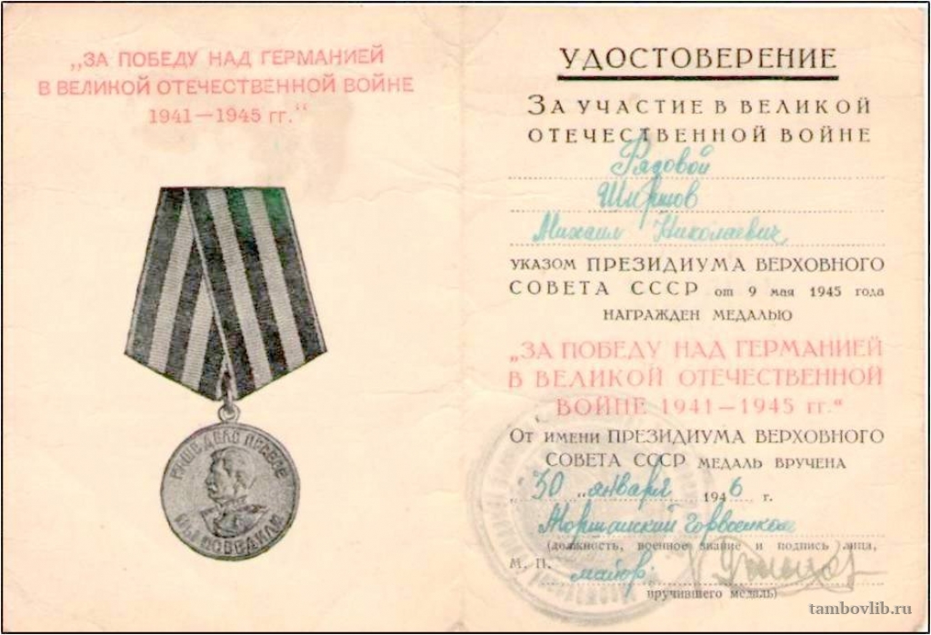 Удостоверение к медали "За победу над Германией в Великой Отечественной войне 1941-1945 гг.", врученной Ширшову Михаилу Николаевичу30 января 1946 ЦБС города Моршанска Документ