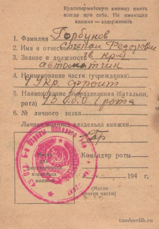Красноармейская книжка Горбунова Степана Федоровича (1917 - 1998)