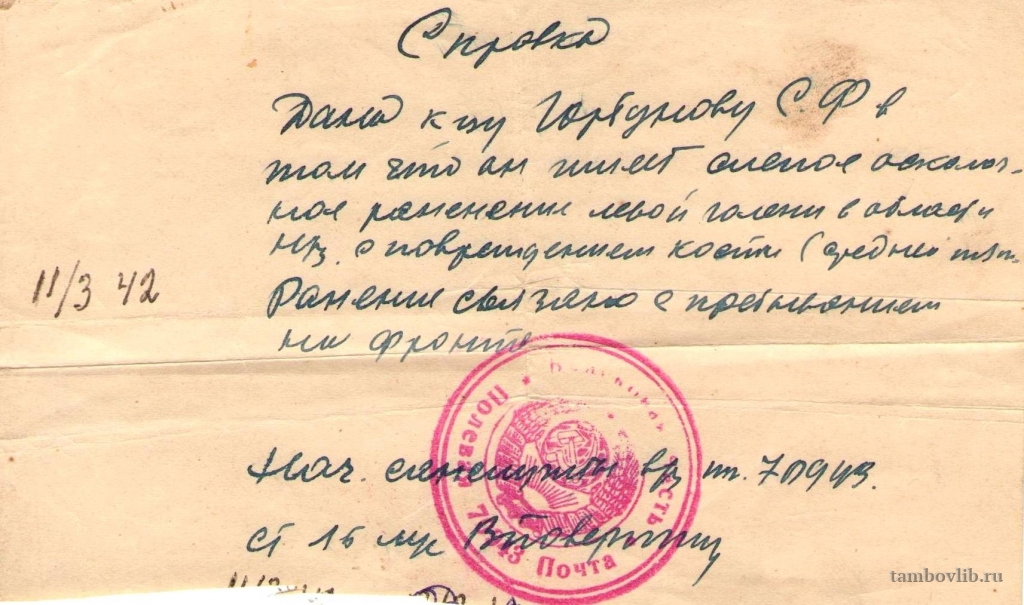 Справка о ранении Горбунова Степана Федоровича (1917 -1998)