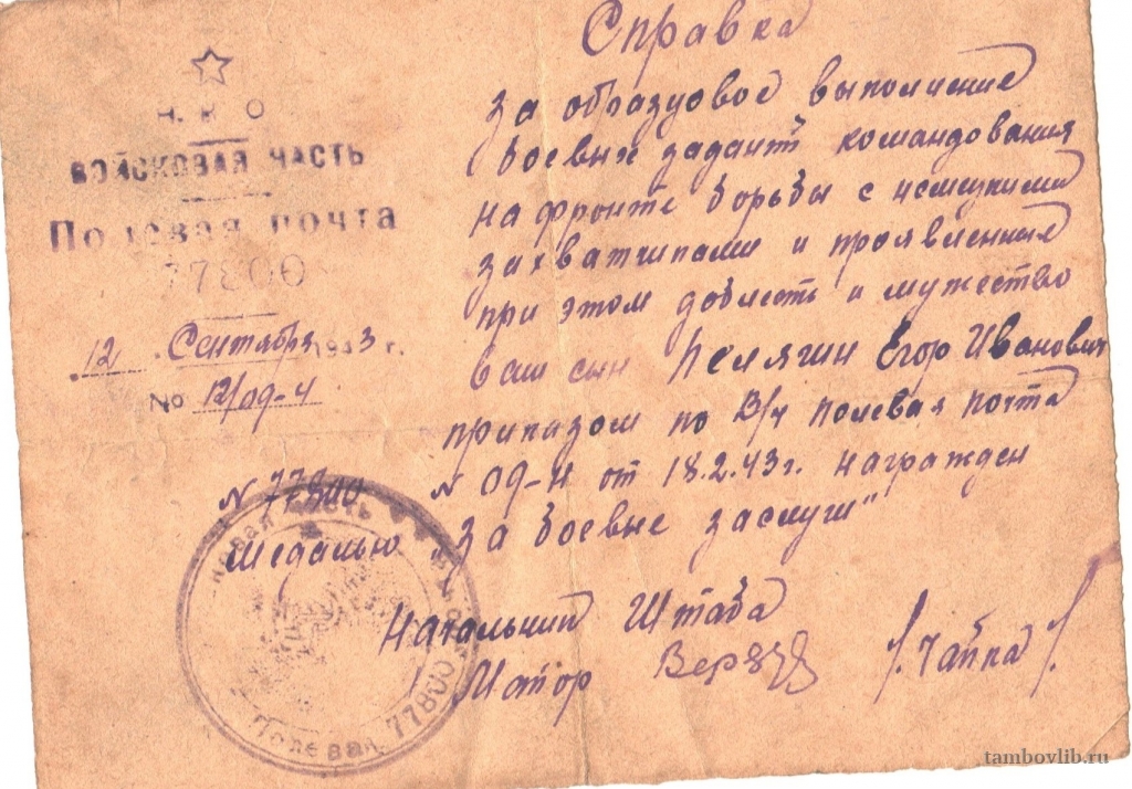 13 сентября 1943 Межпоселенческая центральная библиотека Сосновского района Документ