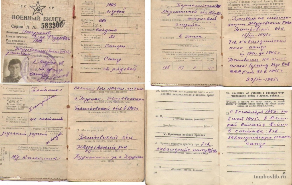 Военный билет Илларионова Егора Федоровича, рожденного в 1903 году в с.Бурнак Жердевского района Тамбовской области.
