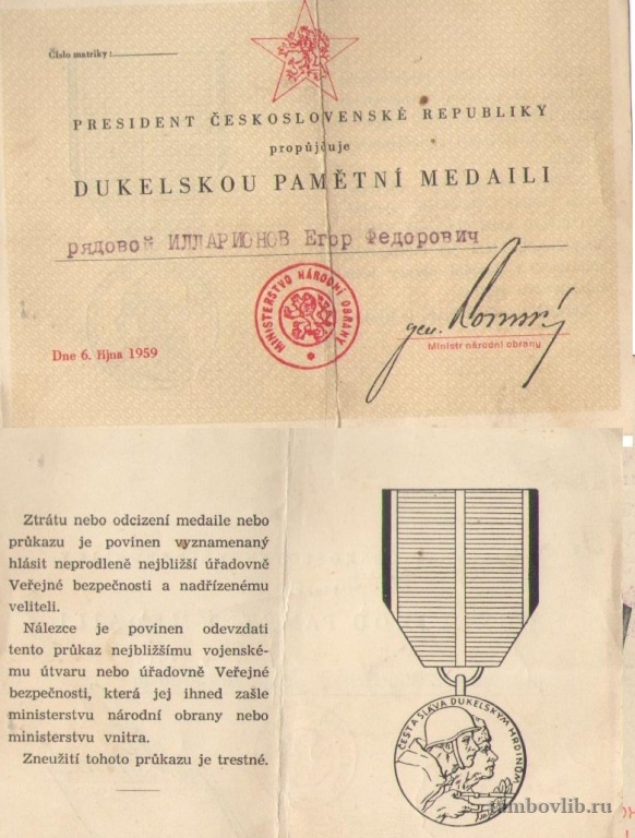 Свидетельство о награждении медалью Чехословакии