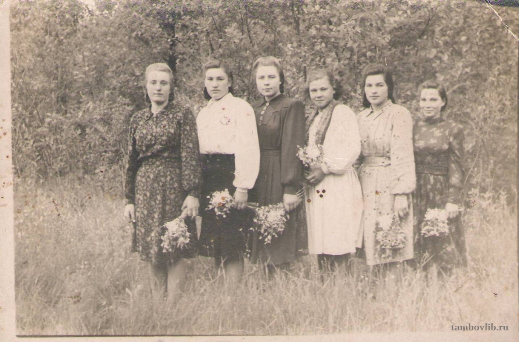 Попова Екатерина Васильевна (1935 г.р.), Попова Раиса Ивановна (1934 г.р.), Попова Валентина Ивановна (1935 г.р.), Гущина Мария Гавриловна (1933 г.р.), Попова Валентина Ивановна (1931 г.р.), Масликова Евдокия Матвеевна (1925 г.р.)1952 Центральная библиотека Мучкапского района Портрет Тамбовская область,Мучкапский