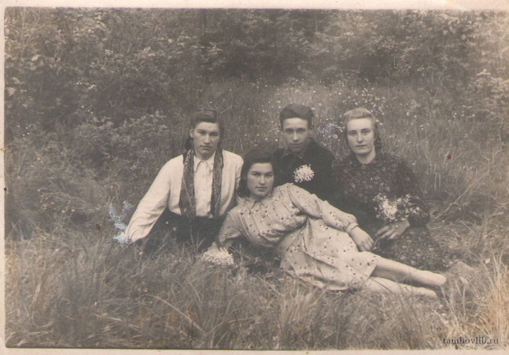 Сидит слева Попова Раиса Ивановна (1934 г.р.), в центре Чеботарев Виктор Владимирович (1938 г.р.), справа Попова Екатерина Васильевна (1935 г.р.), внизу Попова Валентина Ивановна (1931 г.р.)1954 Центральная библиотека Мучкапского района Семейное Мучкапский район, Тамбовская область, Россия